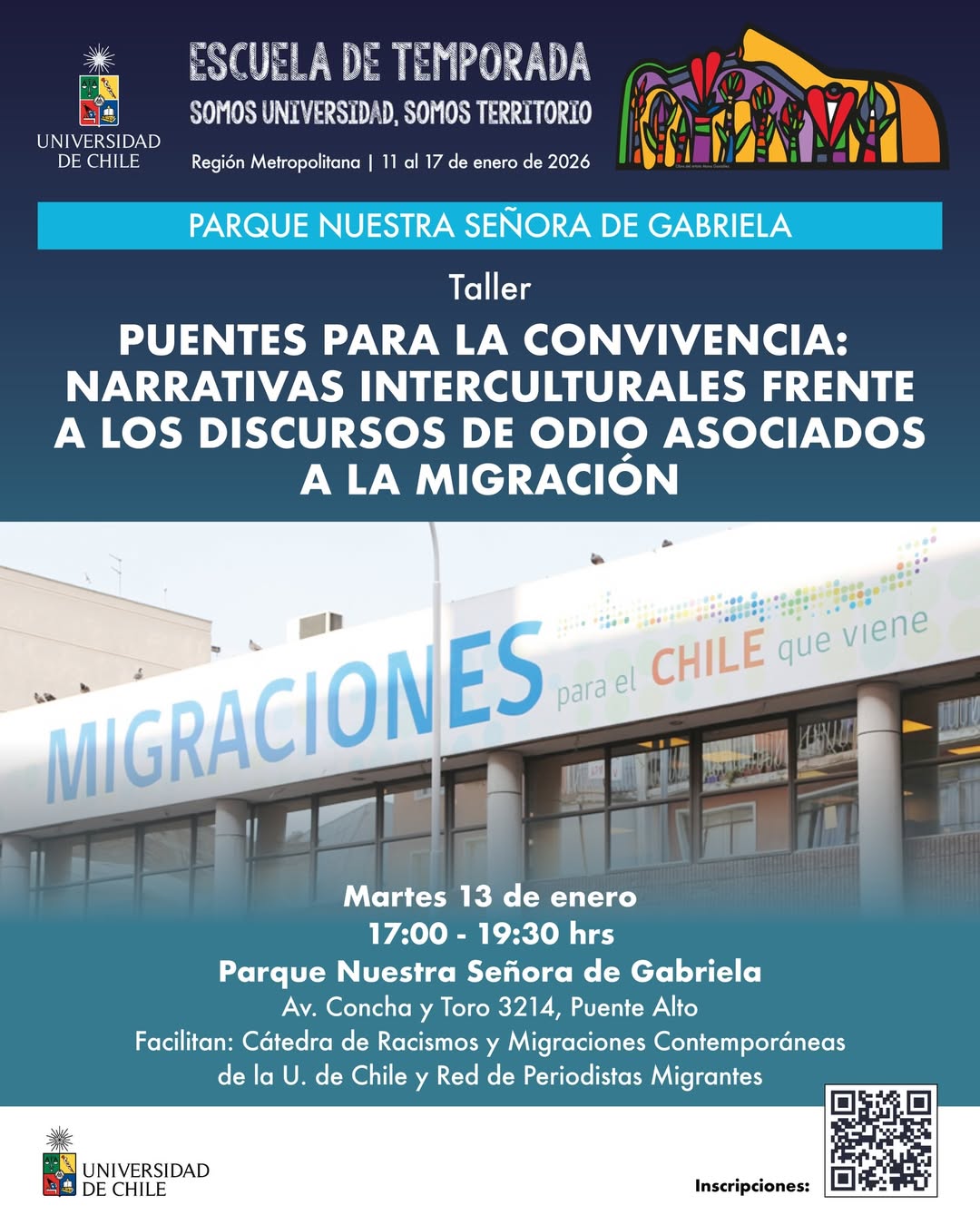 La actividad se realizará el martes 13 de enero, entre las 17:00 y las 19:30 hrs, en el Parque Nuestra Señora de Gabriela (Av. Concha y Toro 3214, Puente Alto), en el marco de la Escuela de Temporada 2026 “Somos universidad, somos territorio” de la Universidad de Chile. La participación es abierta con inscripción previa en el siguiente formulario: